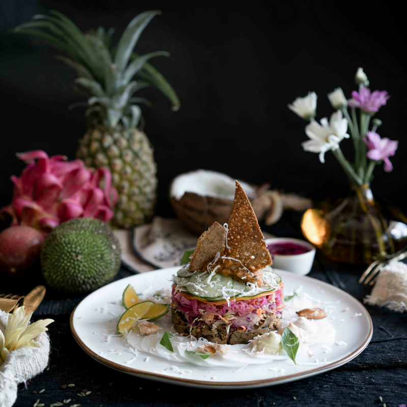 Sweet potato and taro hash browns, crispy mushroom, avocado, grilled tomato, jackfruit sausage, ruccula and papaya chutney, pickle.